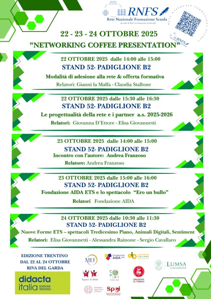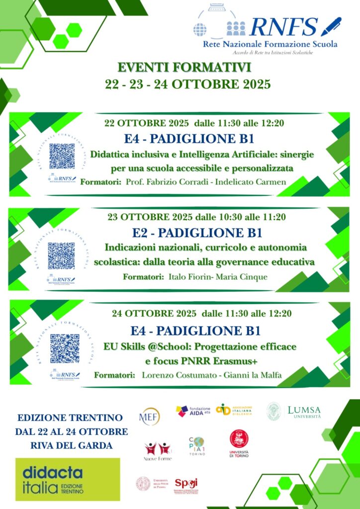 - 22 ottobre dalle ore 11:30 alle ore 11:30 con il seminario Didattica inclusiva e Intelligenza Artificiale: sinergie per una scuola accessibile e personalizzata, presso lo stand E2 – Padiglione B1