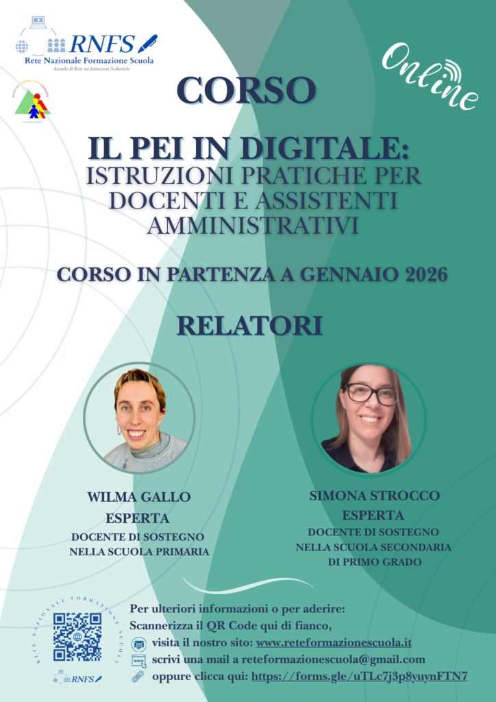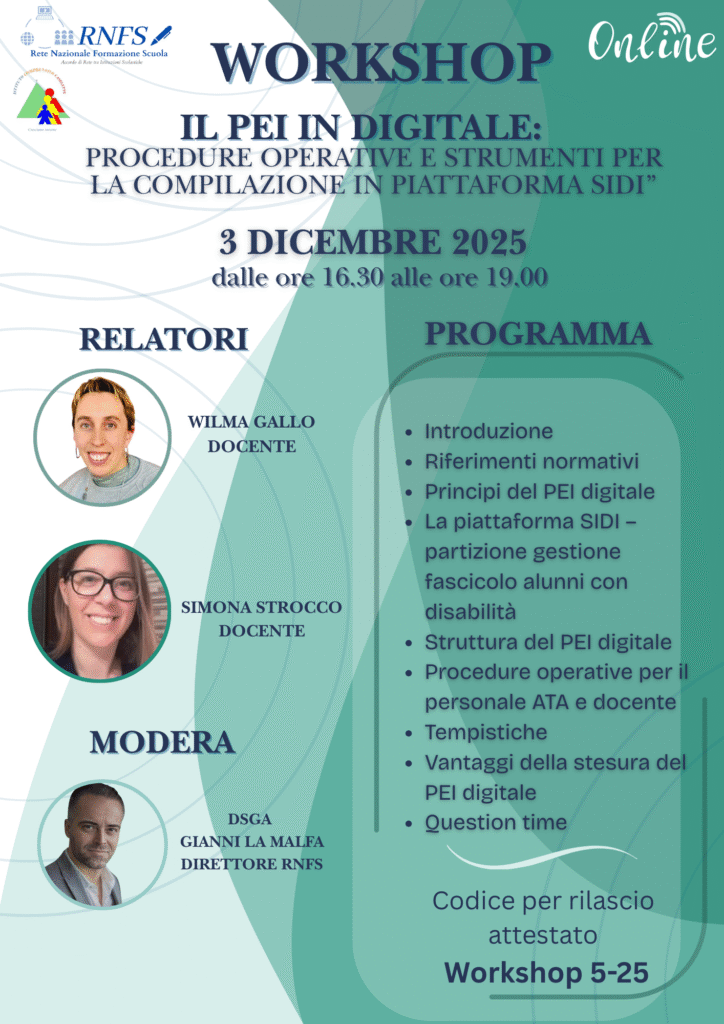 Dopo il grande successo del workshop “Il PEI in digitale: procedure operative e strumenti per la compilazione in piattaforma SIDI”, la Rete Nazionale Formazione Scuola raccoglie le richieste delle scuole e lancia il nuovo corso online dedicato al PEI digitale.